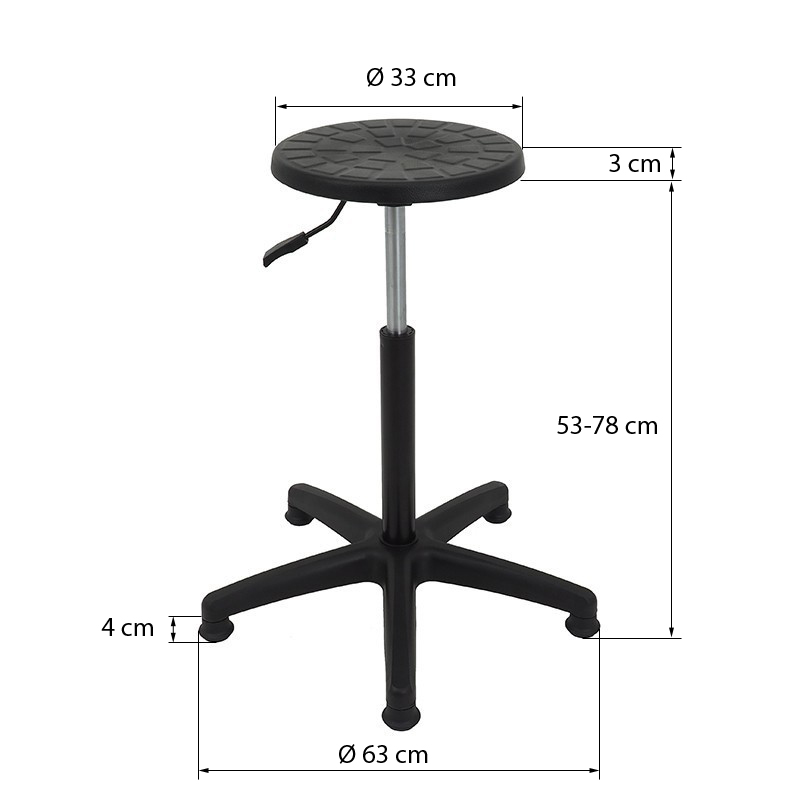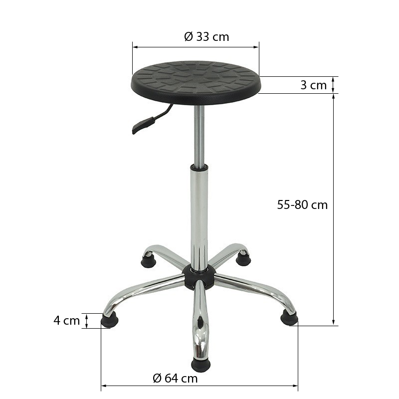 Jeśli pracujesz przy wysokich stanowiskach, ten taboret z wysokim siłownikiem i okrągłym siedziskiem będzie świetnym wyborem. Stabilna podstawa na stopkach zapewnia nieruchome podparcie, a wytłoczony wzór siedziska zapobiega ślizganiu się. Idealny do laboratoriów, produkcji i gabinetów technicznych.